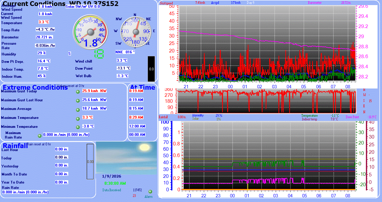 | Maximum Temperature (since midnight) | 1.4°C at: 1:56 PM | Minimum Temperature (since midnight) | -3.0°C at: 12:00 AM |